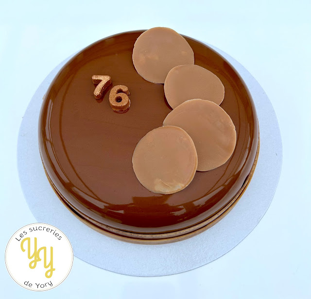 Pour l'anniversaire de beau papa, je lui ai préparé un entremets digne de ce nom avec un beau glaçage miroir et des décors en chocolat .